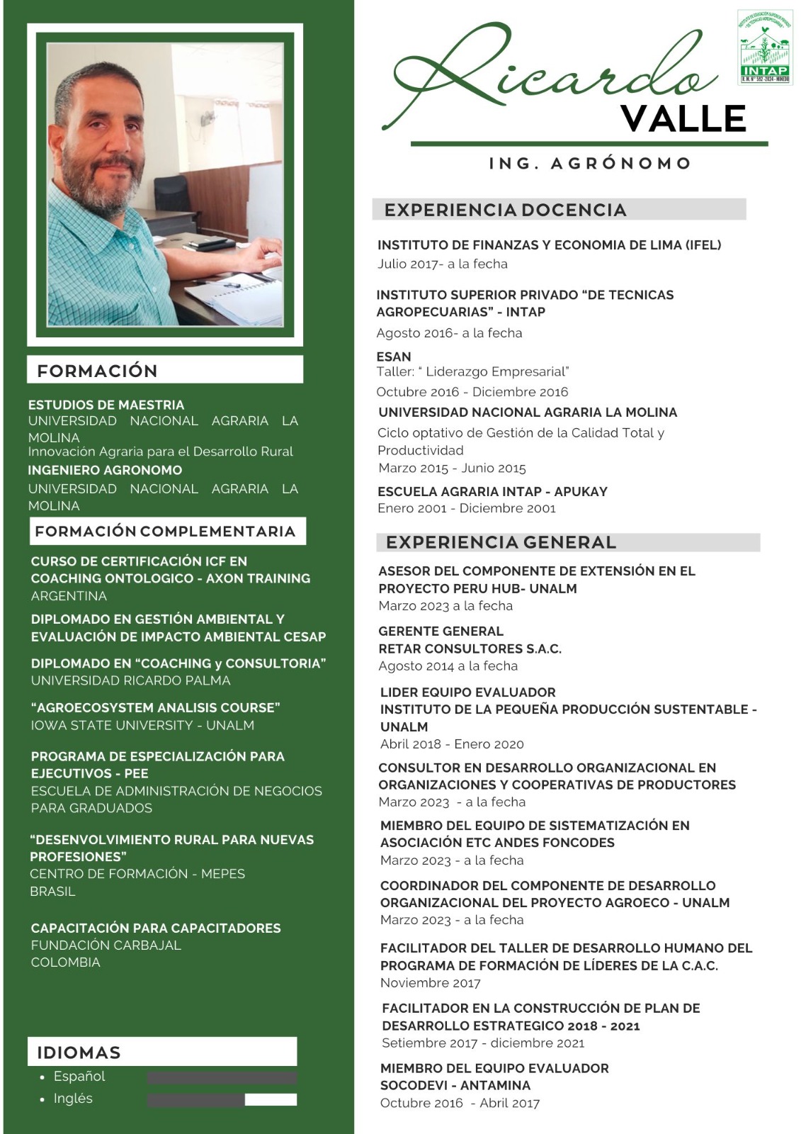 Ingeniero en Ciencias Agrarias, con estudios concluidos de maestría en Innovación Agraria para el Desarrollo Rural en la Universidad Nacional Agraria La Molina. Consultor en proyectos de desarrollo desde el año 2005; facilitador en procesos de capacitación de adultos y metodologías participativas en proyectos de desarrollo agropecuario y planificación estratégica. Consultor y facilitador en temas de desarrollo humano y fortalecimiento organizacional; docente en la formación de jóvenes técnicos agropecuarios, cofundador de RETAR Consultores.